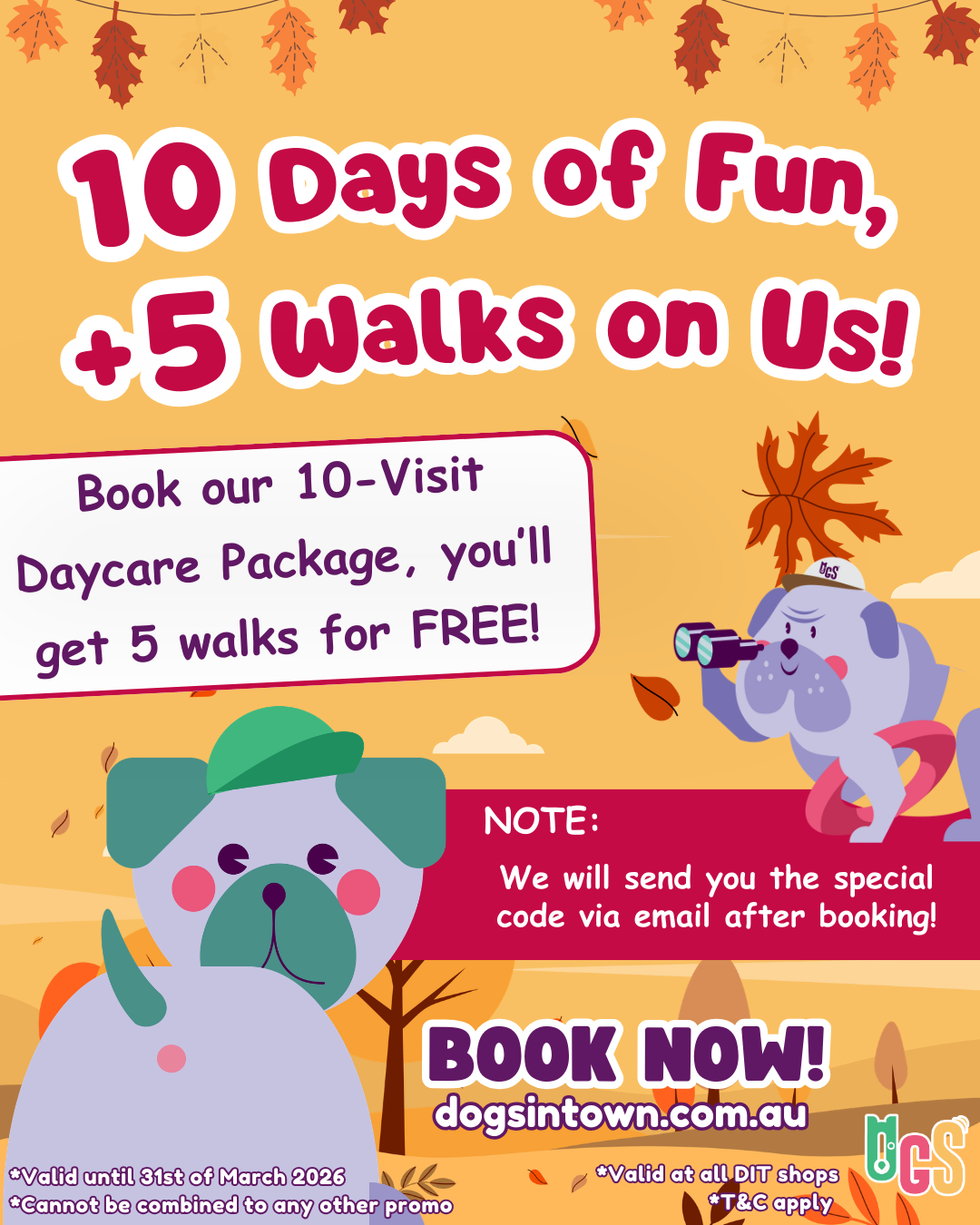 👉 Ready for more wagging and walking?Book our 10-Visit Daycare Package and your dog will get +5 walks FREE! 🌳🐕