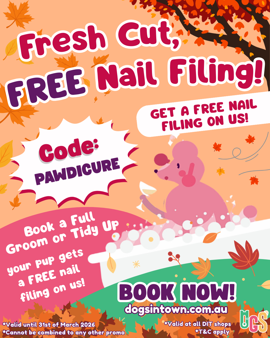 When you book a Full Groom or Tidy Up, your furry bestie gets a FREE nail filing on us!🍁 Use code: PAWDICURE