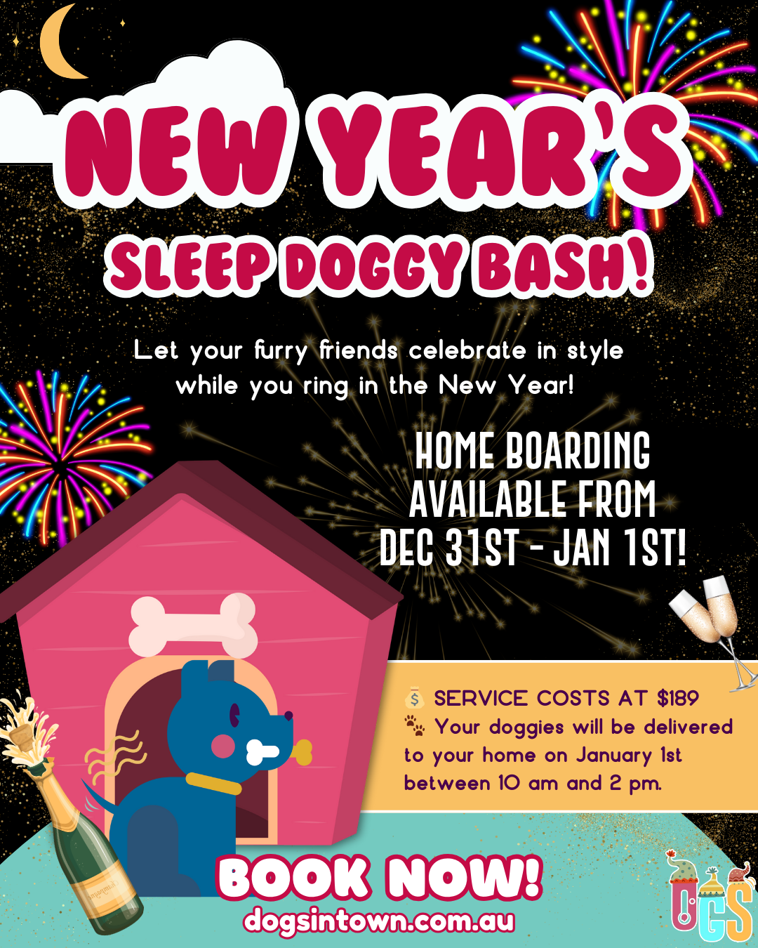 Book here!While you countdown to midnight, let your fur babies enjoy their very own New Year’s Sleep Doggy Bash filled with cuddles, comfort, and celebration vibes!