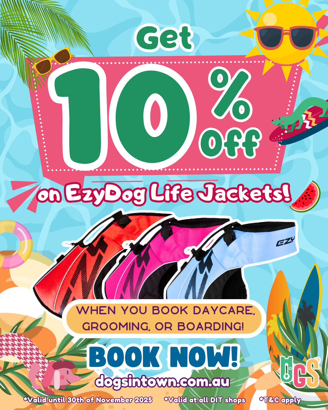 Book hereGet 10% OFF EzyDog Life Jackets when you book your pup’s daycare, grooming, or boarding at Dogs in Town! 🐶💛