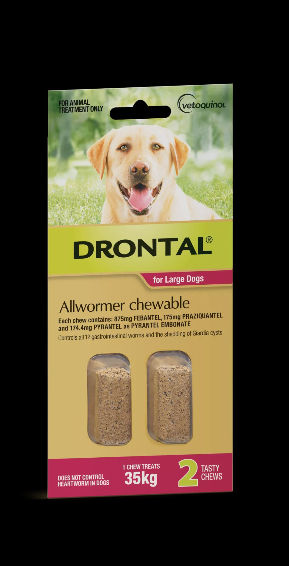 You should be dosing your dog with Drontal® For Large Dogs, Allwormer Chews every three months, or at the beginning of every season to help control Roundworms, Hookworms, Whipworms and Tapeworms. Treat with Drontal® every 6 weeks in Hydatid tapeworm infested locations. If whipworm is a problem, retreat every 6-8 weeks.