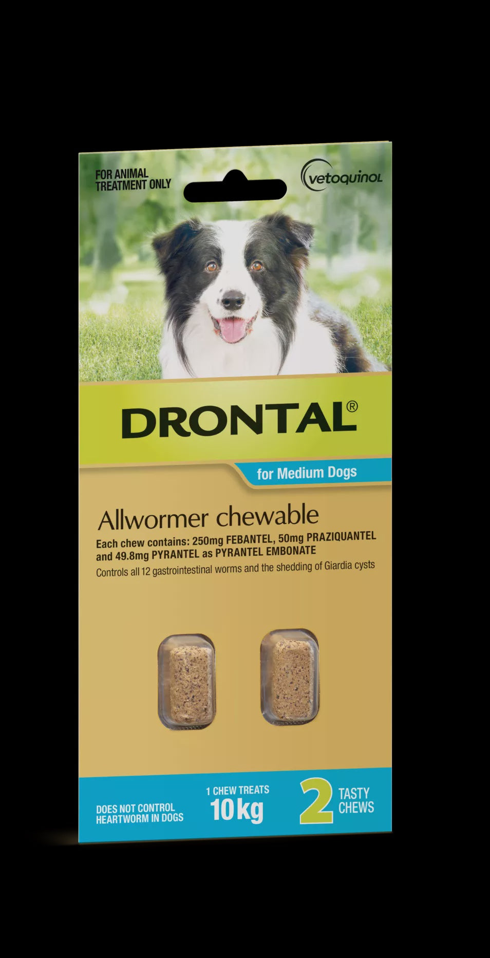 You should be dosing your dog with Drontal® For Medium Dogs, Allwormer Chews every three months, or at the beginning of every season to help control Roundworms, Hookworms, Whipworms and Tapeworms. Treat with Drontal® every 6 weeks in Hydatid tapeworm infested locations. If whipworm is a problem, retreat every 6-8 weeks.