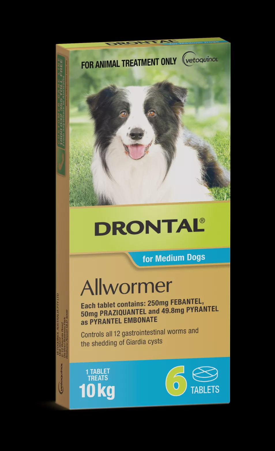 You should be dosing your dog with Drontal® For Medium Dogs, Allwormer Tablets every three months, or at the beginning of every season to help control Roundworms, Hookworms, Whipworms and Tapeworms. Treat with Drontal® every 6 weeks in Hydatid tapeworm infested locations. If whipworm is a problem, retreat every 6-8 weeks.