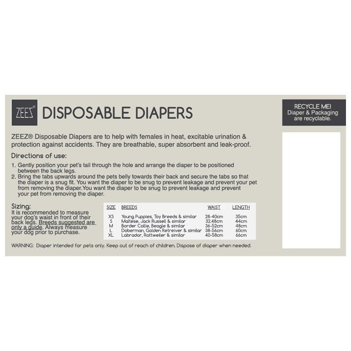 ZEEZ® Disposable Diapers are to help with females in heat, excitable urination & protection against accidents. They are breathable, super absorbent & leak-proof Available in a 12 pack. NOTE: ZEEZ® Disposable Diapers and their packaging are recyclable!